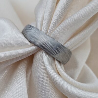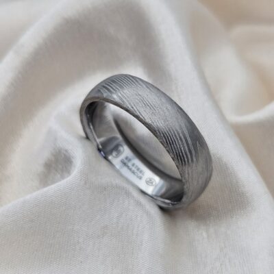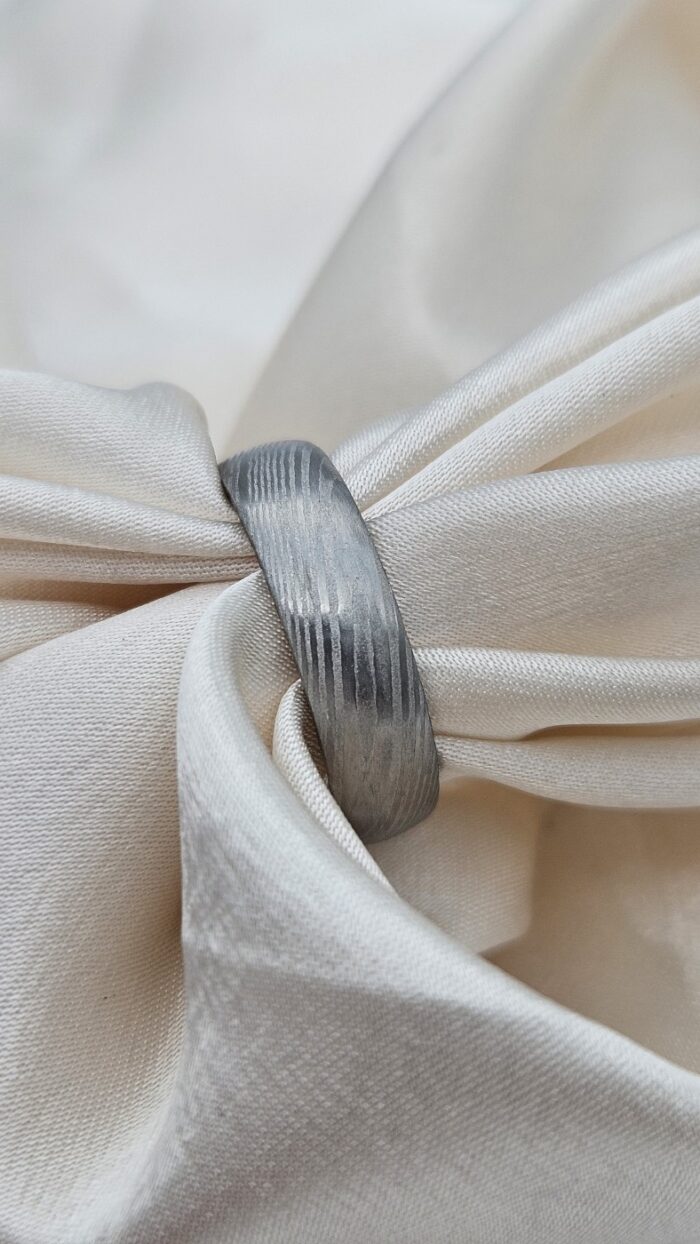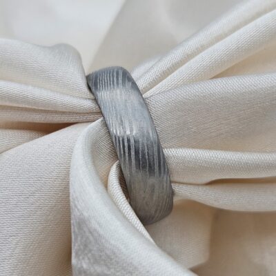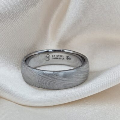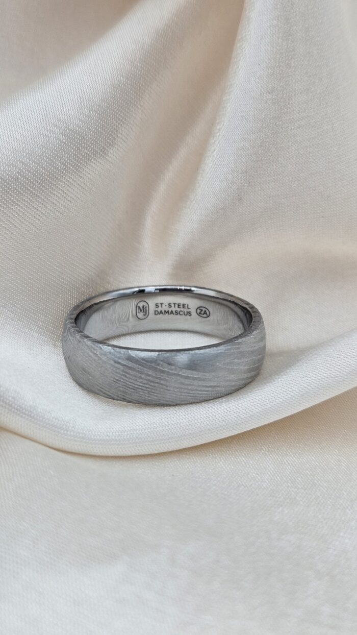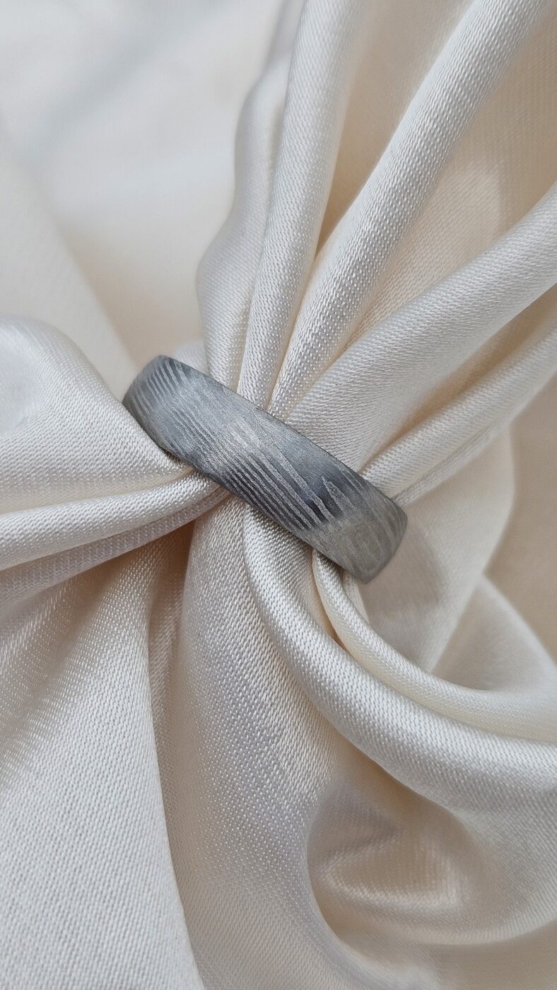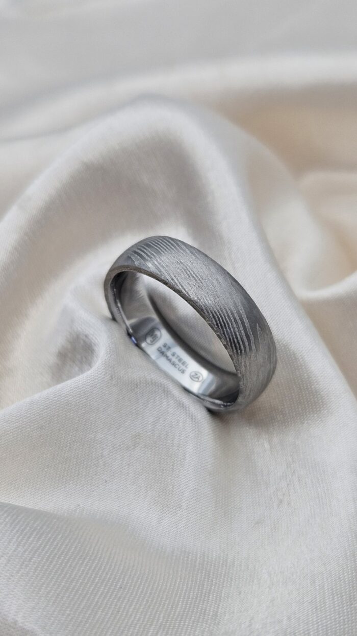 Nothing added. Nothing needed. Crafted from layered stainless steel using ancient forging techniques, this D-shaped band is all about clean form and quiet strength. The Damascus pattern — naturally formed through heat, pressure, and patience — wraps around the ring in one continuous, organic flow. Every line tells a story. No two are alike.